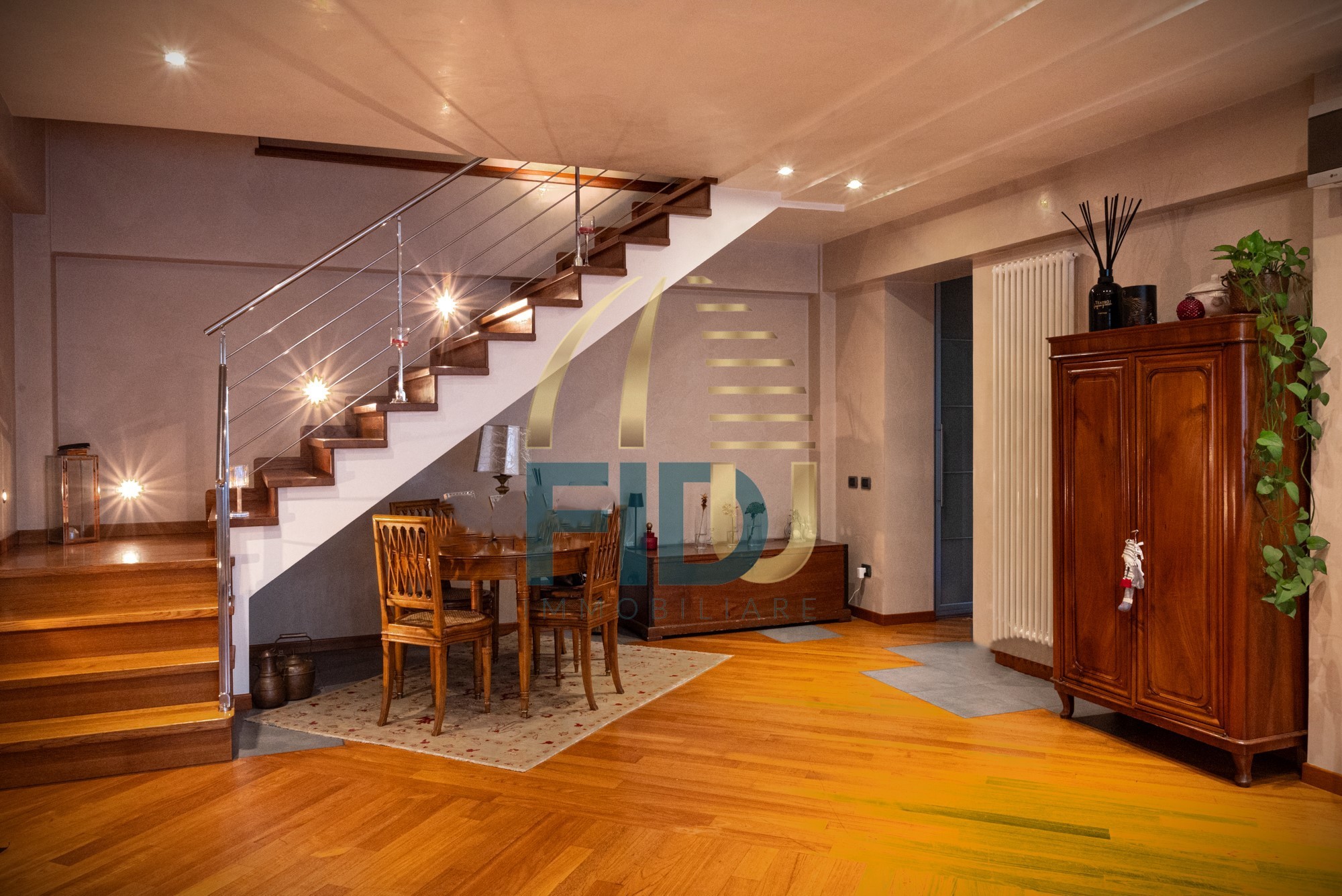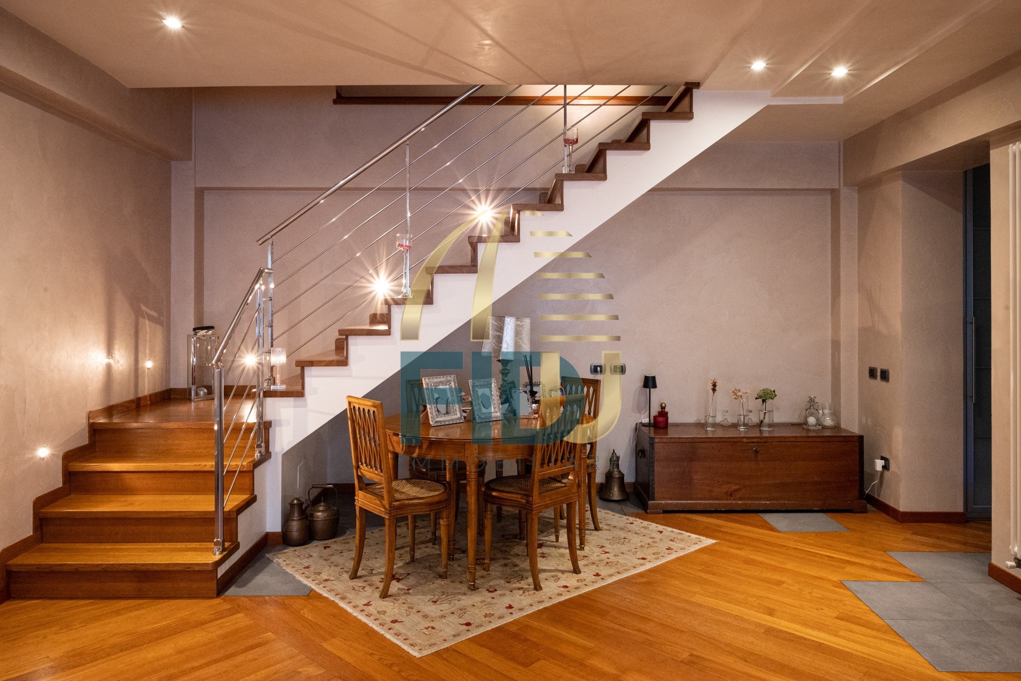 All’ingresso ci accoglie una ampia e luminosa zona giorno, cucina e un bagno. Al primo piano troviamo tre camere da letto, un bagno e una loggia. Dal corridoio, attraverso una scala di arredo, si accede ad un grande sottotetto completamente rifinito.